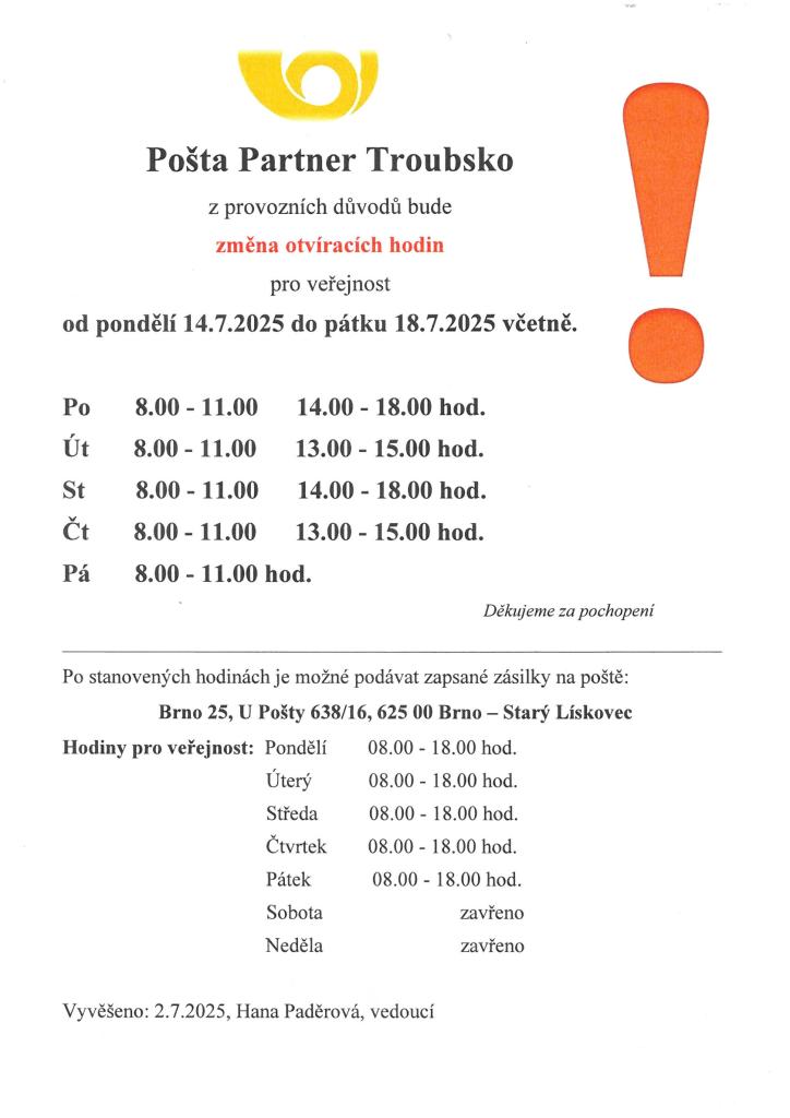 Pošta Troubsko - Změna otevíracích hodin 1
