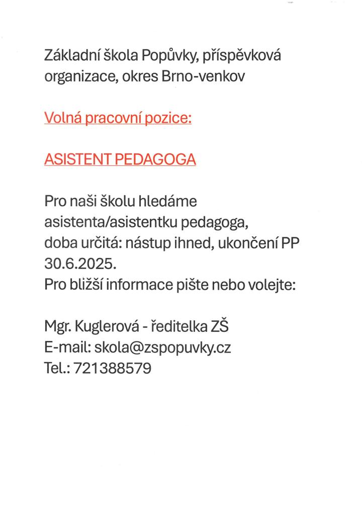 Volná pracovní pozice: Asistent pedagoga 1